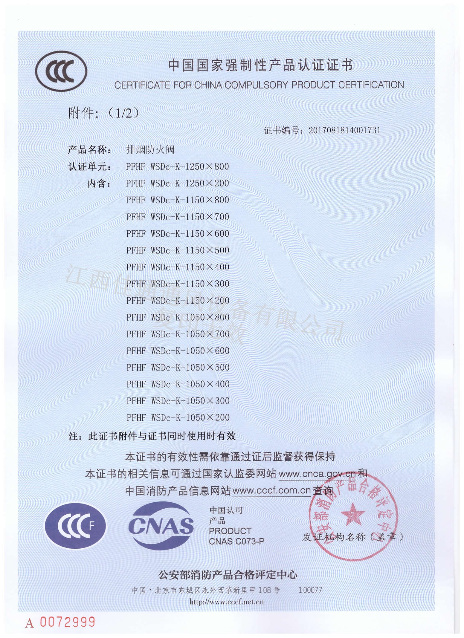 消防3C認(rèn)證證書(shū)排煙防火閥1250×800(分型1)