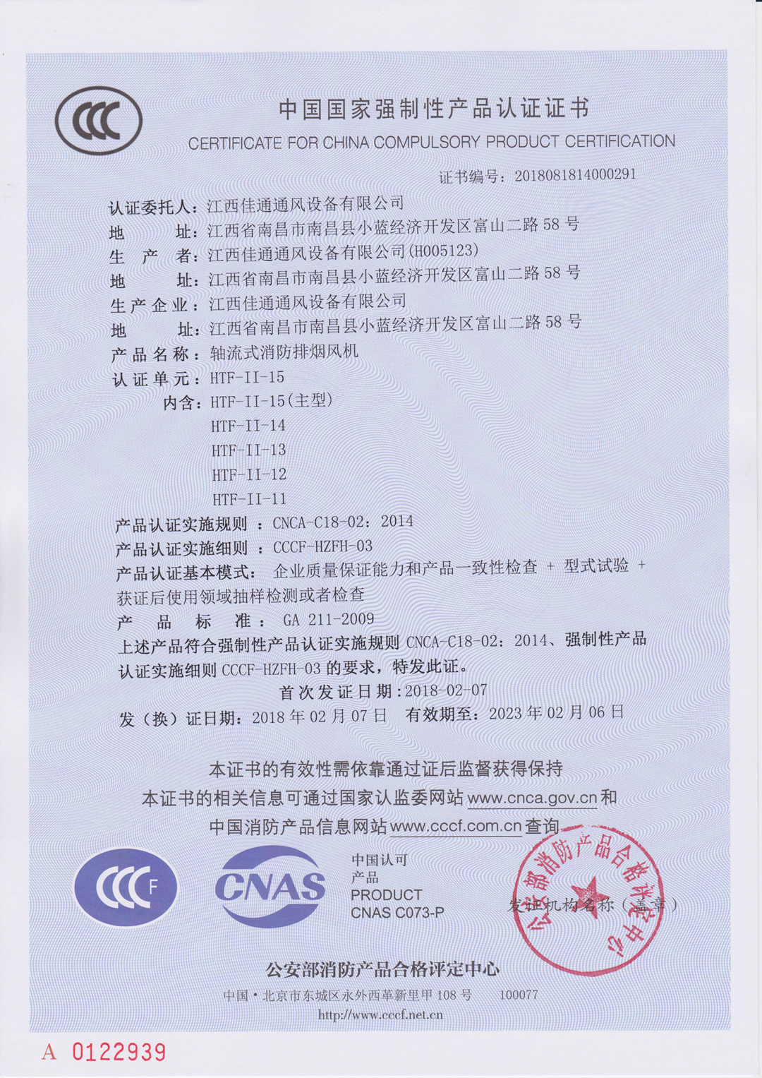 當(dāng)前位置:風(fēng)機(jī)廠家 > 資質(zhì)證書 > 軸流式消防排煙風(fēng)機(jī)(雙速)HTF-II-15(主型)消防3C認(rèn)證證書