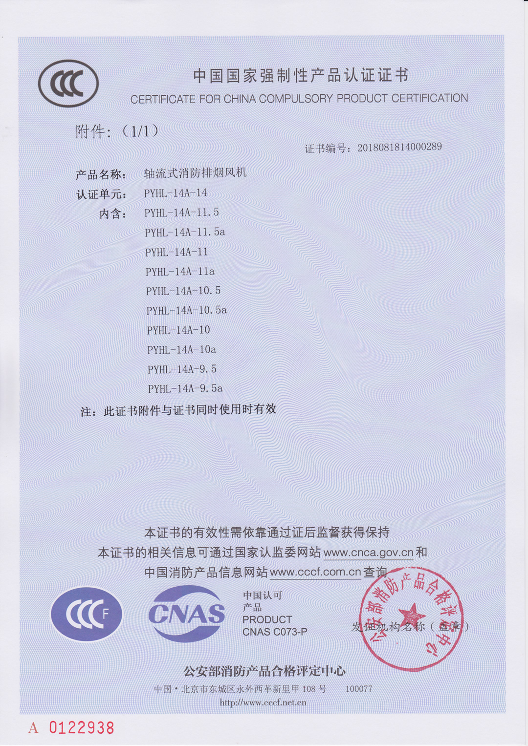 軸流式消防排煙風機PYHL-14A-14(分型)消防3C認證證書