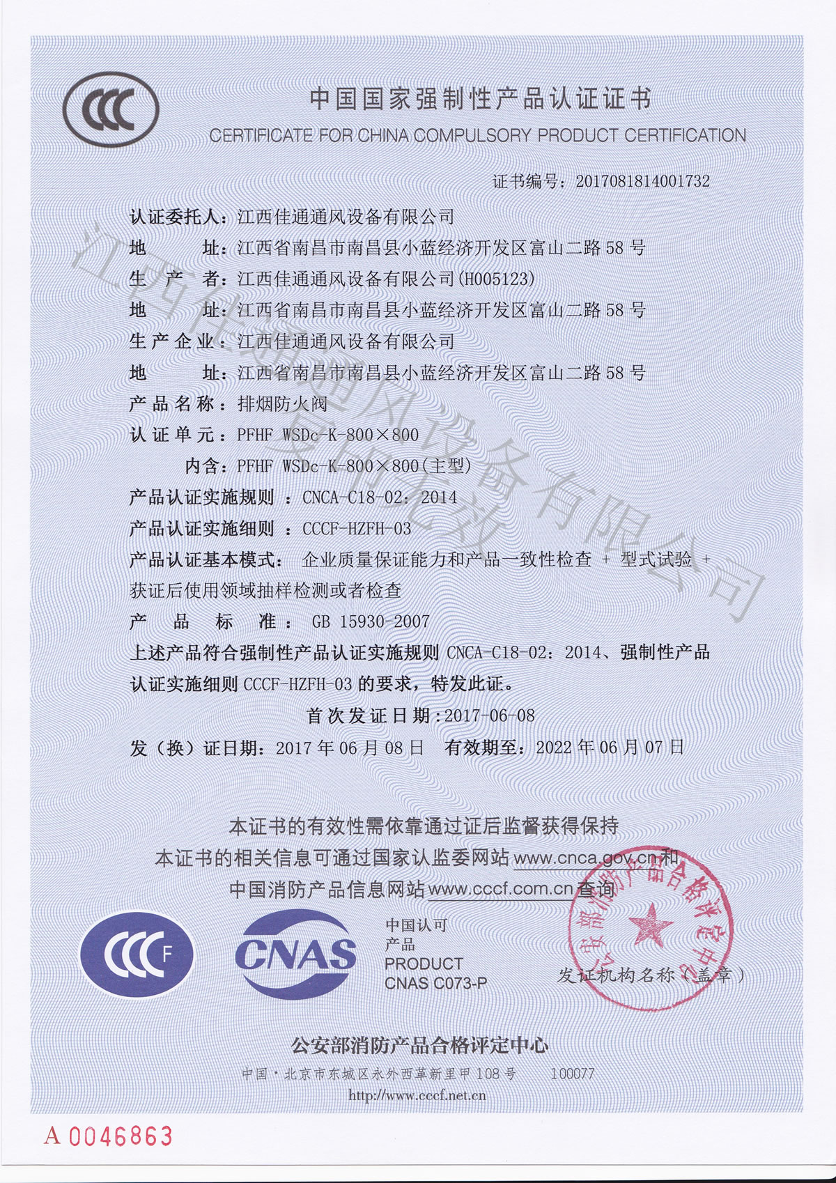 想了解更多請點擊===>>排煙防火閥3C認證證書 3C排煙防火閥 排煙防火閥