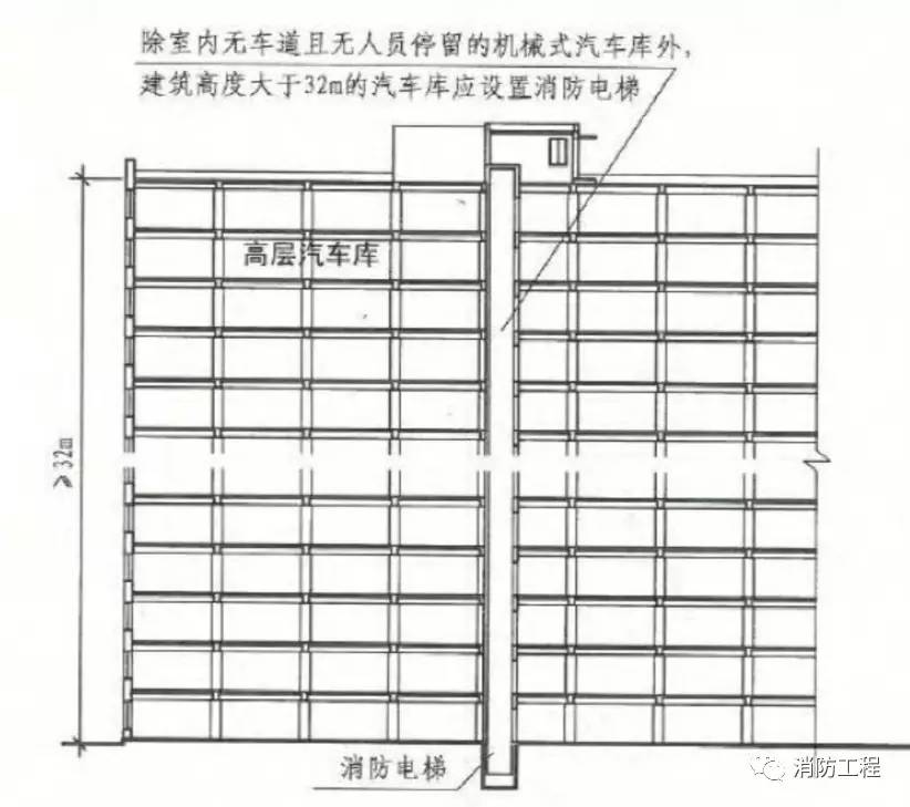 6.0.4 除室內無車道且無人員停留的機械式汽車庫外,建筑高度大于32m的汽車庫應設置消防電梯。消防電梯的設置應符合現行國家標準《建筑設計防火規范》GB50016的有關規定。