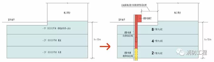 舉例:某地下室埋深大于10m,地下室每層建筑面積為8000㎡,-1F為非機動車庫和辦公,-2F為商場,-3F為車庫。則-1F應劃分8個分區,設置8部消防電梯,其突出地面不在主體范圍內部分要做消防電梯廳,防火間距按照多層建筑考慮;-2F應劃分4個分區,上面8部消防電梯只需4部到達即可;-3F消防電梯則可到達,也可不到達。