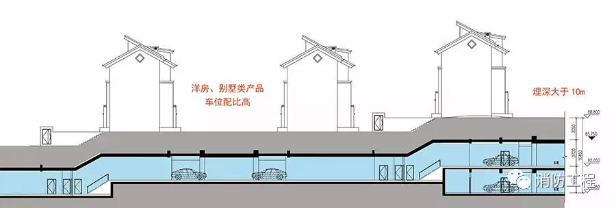 對項目而言,高層公共建筑和住宅由于其地上部分一般都有消防電梯,因此地下車庫設消防電梯較為容易,但是對高度較矮、地上單層建筑面積不大,地庫規模和埋深卻較大的住宅而言,套用《建規》設置消防電梯意味著公攤面積變大、成本上升,甚至影響產品品質,這種情況下,地下車庫不設消防電梯就顯得意義重大了(如下圖)。