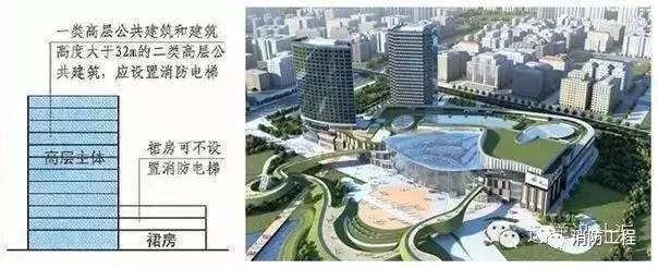 根據在《建規》圖示7-10頁圖2,明確裙房可不設消防電梯,商業網點亦然。
