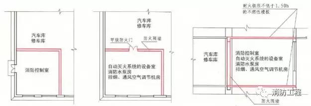 5.1.9 附設在汽車庫、修車庫內的消防控制室、自動滅火系統的設備室、消防水泵房和排煙、通風空氣調節機房等,應采用防火隔墻和耐火極限不低于1.50h的不燃性樓板相互隔開或與相鄰部位分隔。