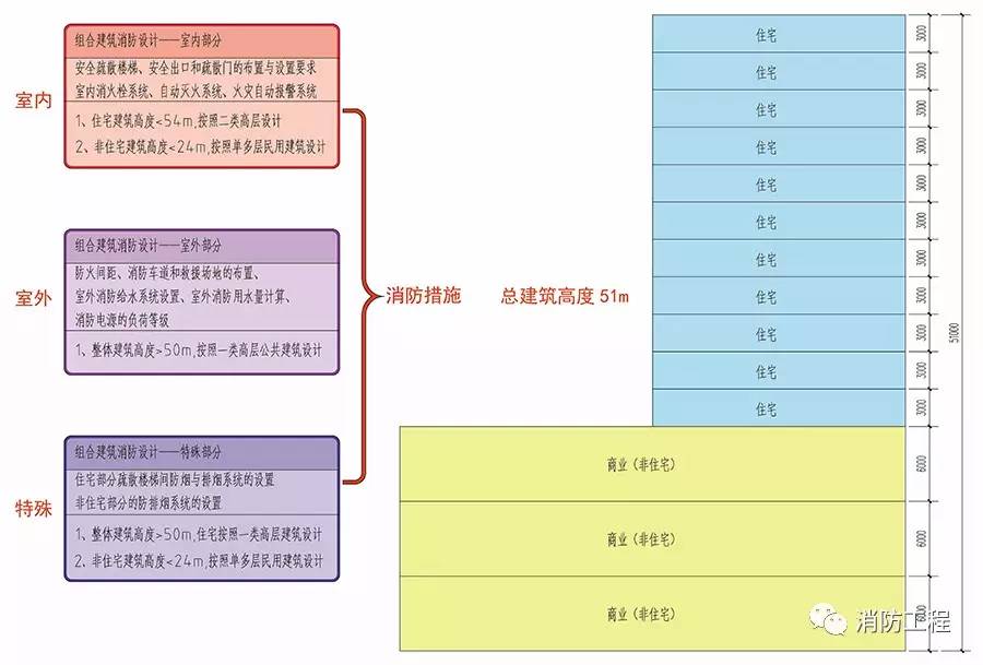 解讀:除商業服務網點外,住宅建筑與其他使用功能的建筑合建時消防措施“室內有別,室外一體”。