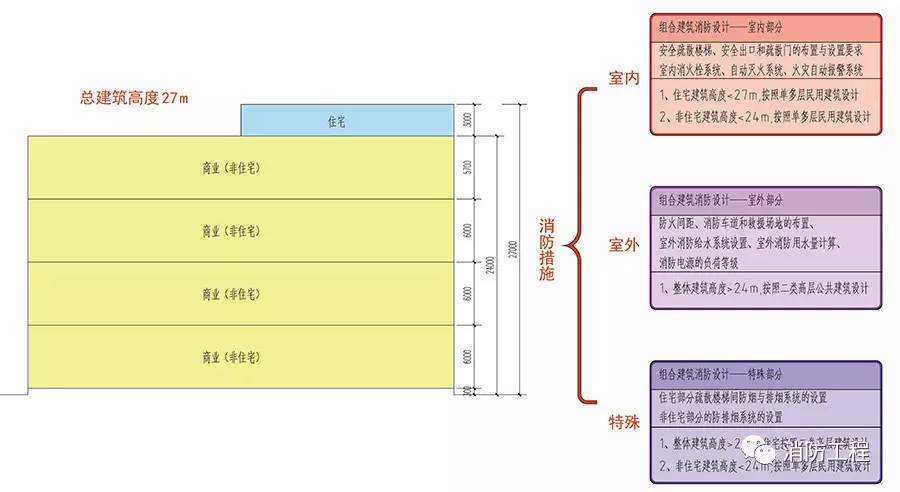 即組合建筑室內的消防設計,如住宅部分和非住宅部分的安全疏散樓梯、安全出口和疏散門的布置與設置要求,防火分區劃分,室內消火栓系統、自動滅火系統、火災自動報警系統等的設置,可以根據各自部分的建筑高度,按照《建規》有關住宅和公建的要求分別確定;