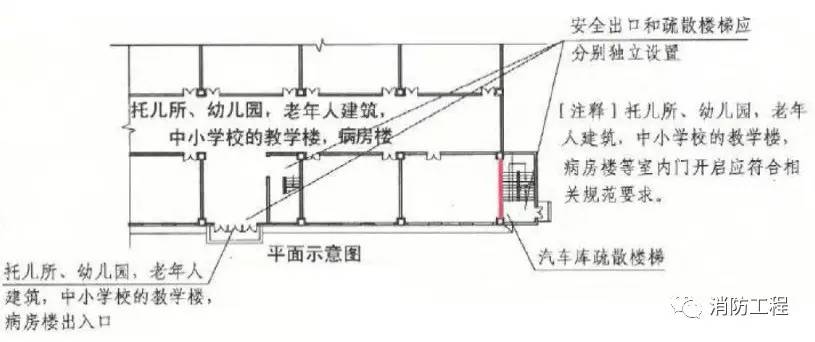 4.1.4 當符合下列要求時,汽車庫可設置在托兒所、幼兒園,老年人建筑,中小學校的教學樓,病房樓等的地下部分:2.汽車庫與托兒所、幼兒園,老年人建筑,中小學校的教學樓,病房樓等的安全出口和疏散樓梯應分別獨立設置。