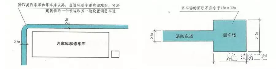 4.3.2 消防車道的設置應符合下列要求:1.除Ⅳ類汽車庫和修車庫以外,消防車道應為環形,當設置環形車道有困難時,可沿建筑物的一個長邊和另一邊設置;2.盡頭式消防車道應設置回車道或回車場,回車場的面積不應小于12m×12m;3.消防車道的寬度不應小于4m。