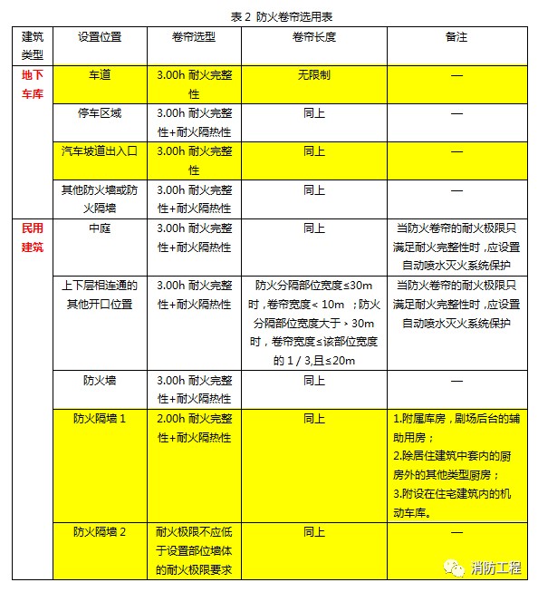 防火卷簾的選用主要考慮三個方面,即設置位置、卷簾選型和卷簾長度。其中,《車規》5.1.1、5.2.6~7、5.3.3對汽車庫防火卷簾,《建規》5.3.2~3、6.2.3、6.5.3和條文解釋5.5.9則對民用建筑防火卷簾的選用做了要求,統計分析如下表2。