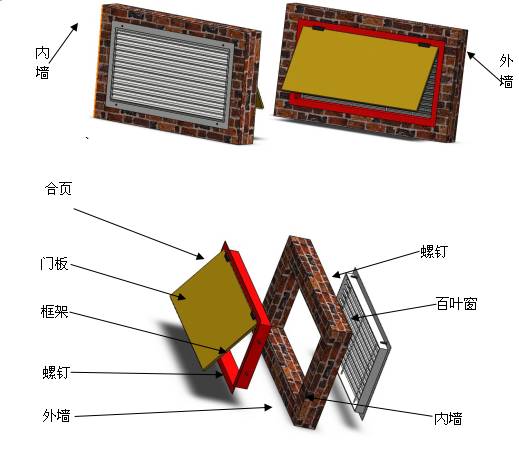 3、按圖1、圖2所示用M5x40膨脹螺栓安裝泄壓裝置及百葉窗。