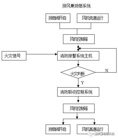 2、通風與排煙共用一套系統。在系統管道上或排風兼排煙風機的排風口處設置排煙閥,平時呈開啟狀態,排風兼排煙風機低速運行。一旦火災發生時,排風兼排煙風機高速運行。