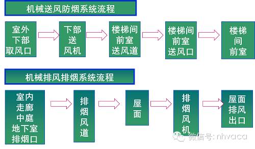 該系統的風源必須吸自室外,且不應受到煙氣的污染。一般情況該系統與排煙系統共同存在,如下圖示。