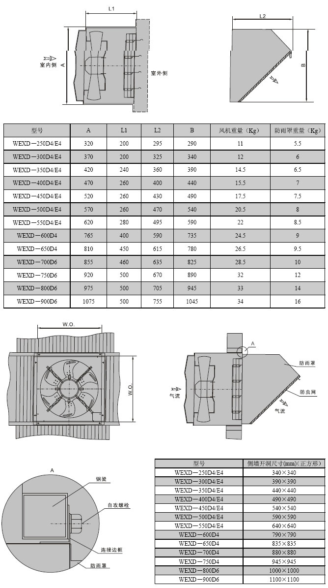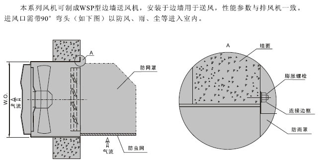 DWEX邊墻風機又叫WEX邊墻風機,其采用先進的前掠型葉片、低噪音的外轉子或內轉子風機專用電機直聯傳動,方形外殼設計可以方便地安裝在混凝土墻、磚墻或輕鋼壓型墻板上,方形防雨罩結構牢固,外形美觀。具有噪聲低、風量大、運行可靠、性能參數范圍廣、安裝簡便等特點。根據輸送介質的要求,可制成防腐、防爆型。 DWEX(WEX)系列風機一般用于邊墻壁式排風,配設45°防雨罩(或特殊制造成60°)和防蟲網(夜間可防止昆蟲循燈光飛入車間)。可按需要制成邊墻送風機型號為DWSP(WSP),配設90°防雨罩(防風、雨、塵)和防蟲網(夜間可防止昆蟲循燈光飛入車間)。