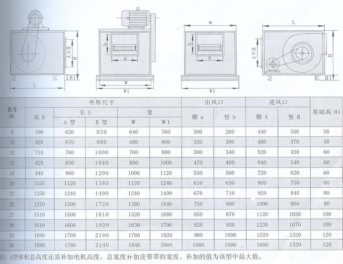 型號(Ⅰ型為單速、Ⅱ型為雙速、III型為后傾葉輪高壓型)