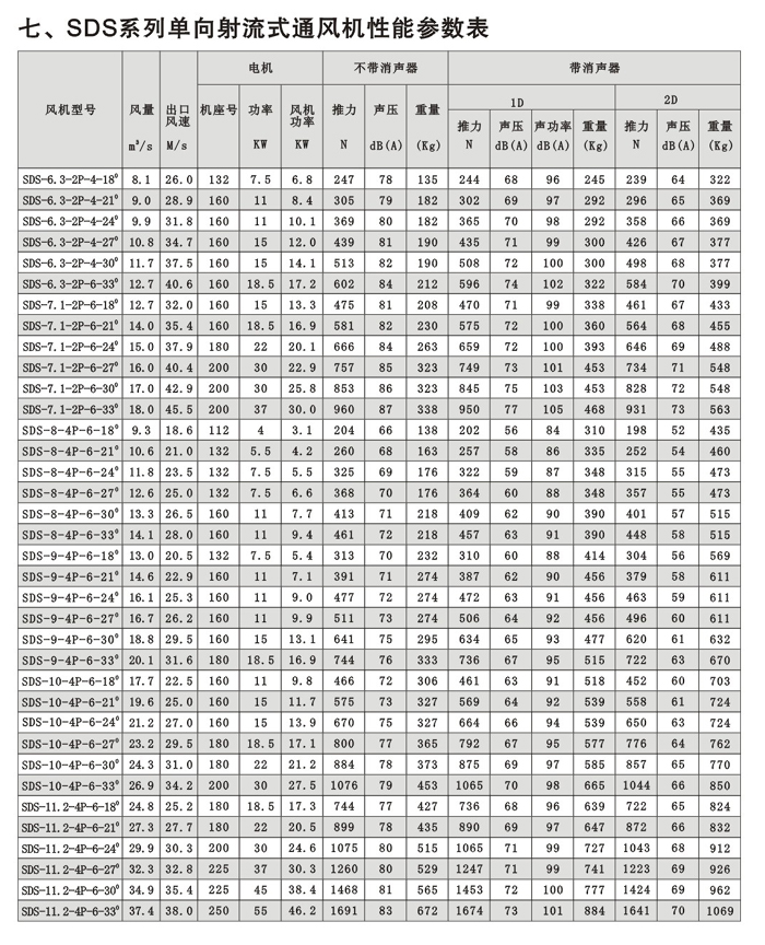 SDS系列射流風機規格自(1)400mm—①1600mm,分單向運轉軸流風機和可逆式(雙向)運轉軸 流風機二大類,最大推力有3500N,對任一負荷和工況均可選擇高效、低噪聲的風機。