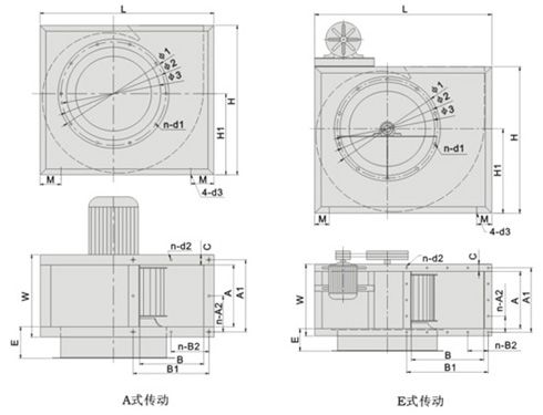 本系列風(fēng)機(jī)分為A式直聯(lián)傳動(dòng)和E式皮帶傳動(dòng),按葉輪旋轉(zhuǎn)方向?yàn)樽笮陀倚D(zhuǎn)方向從電機(jī)或皮帶輪側(cè)看為準(zhǔn),以出風(fēng)口分為0 °、90 °、180 °、270 °四種出風(fēng)方式,訂貨時(shí)需注明。